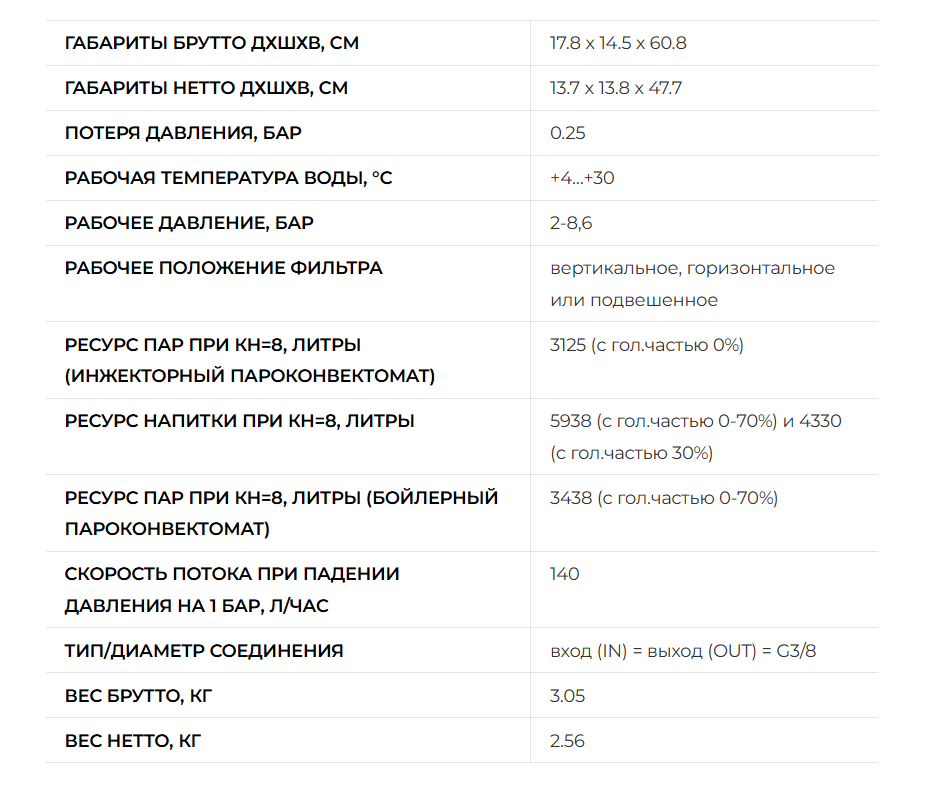 Так как тест для воды °КН (для измерения карбонатной жесткости холодной водопроводной воды на объекте монтажа фильтра) в комплект не входит, Вы можете приобрести его у нас: обязателен для проведения индивидуальной настройки фильтра. После определения фактического значения °КН Вы сможете увидеть фактический ресурс приобретенного фильтра, а также значение настройки bypass в соответствующей Таблице ресурсов (см. Файлы) Рекомендуем оценить целесообразность приобретения счетчика расхода воды. Для темы ПАР счетчик ОБЯЗАТЕЛЕН, так как без него невозможно обеспечить своевременную замену сменного картриджа. Если счетчик не нужен (тема НАПИТКИ), то необходимо, исходя из фактических ресурса картриджа и водопотребления потребляющего оборудования (например, кофемашины, для которой Вы приобретаете фильтр), рассчитать срок эксплуатации картриджа. После этого на стикере картриджа в специальной зоне указать порядковый номер календарного месяца, в котором должна быть произведена очередная замена отработавшего сменного картриджа и контролировать наступление момента замены. Фильтр необходимо подсоединить к водопроводу и к потребляющему оборудованию. Для этого нужно 2 шланга. Размер входного (IN) и выходного (OUT) патрубков на головной части фильтра – G3/8 (внешняя резьба). ВНИМАНИЕ! Патрубки – пластиковые, поэтому максимальное усилие при монтаже – 14 Нм.